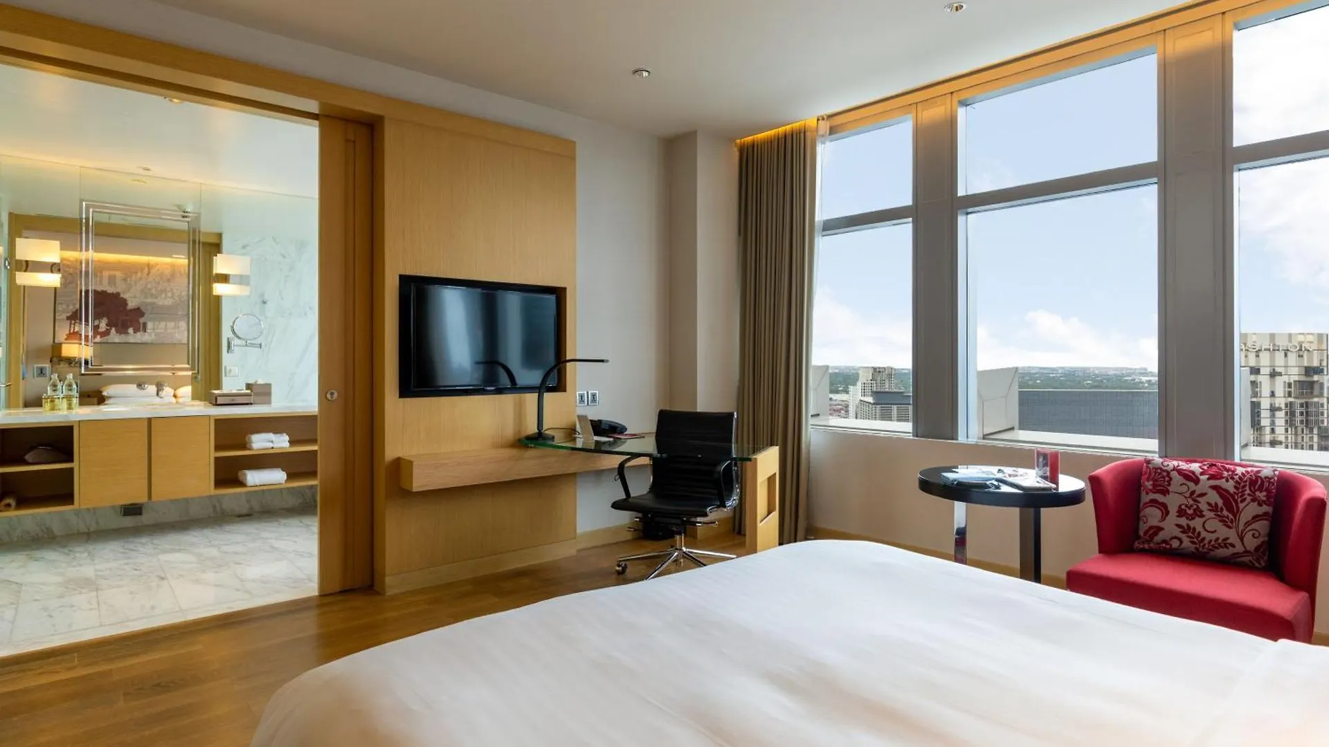 Einige der 525 eleganten Zimmer verfügen über einen Mini-Bar-Kühlschrank und einen elektrischen Wasserkocher sowie bieten eine individuelle Klimaregelung und ein Zusatzbett an. Zu den Extras gehören eine begehbare Dusche und ein Whirlpool. Die privaten Badezimmer sind mit einem Haartrockner und Badelaken. In den Zimmern des Hotels hat man einen schönen Blick auf die Skyline.